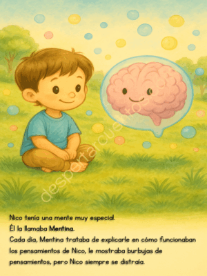 Nico tiene una mente muy especial a la que llama Mentina. Cada día, Mentina le muestra burbujas de pensamientos: algunas lo llenan de alegría, otras le traen miedo o dudas. Poco a poco, Nico descubre que esas burbujas aparecen y desaparecen solitas, y que solo necesita observarlas sin dejarse atrapar por ellas.